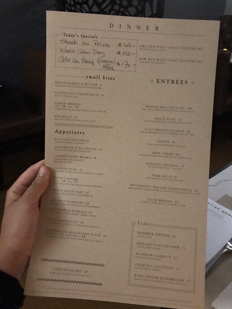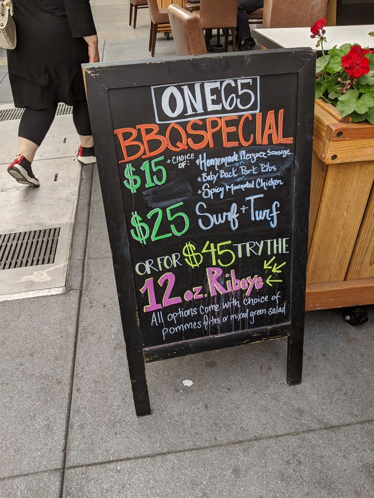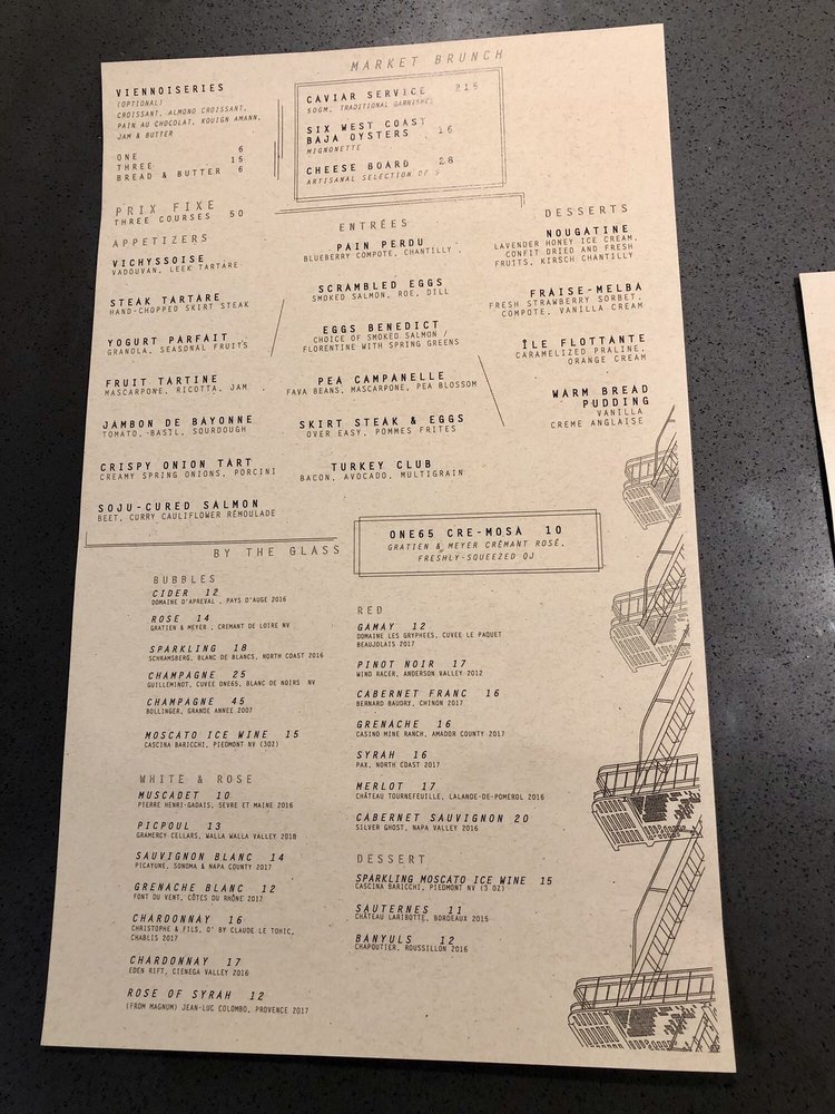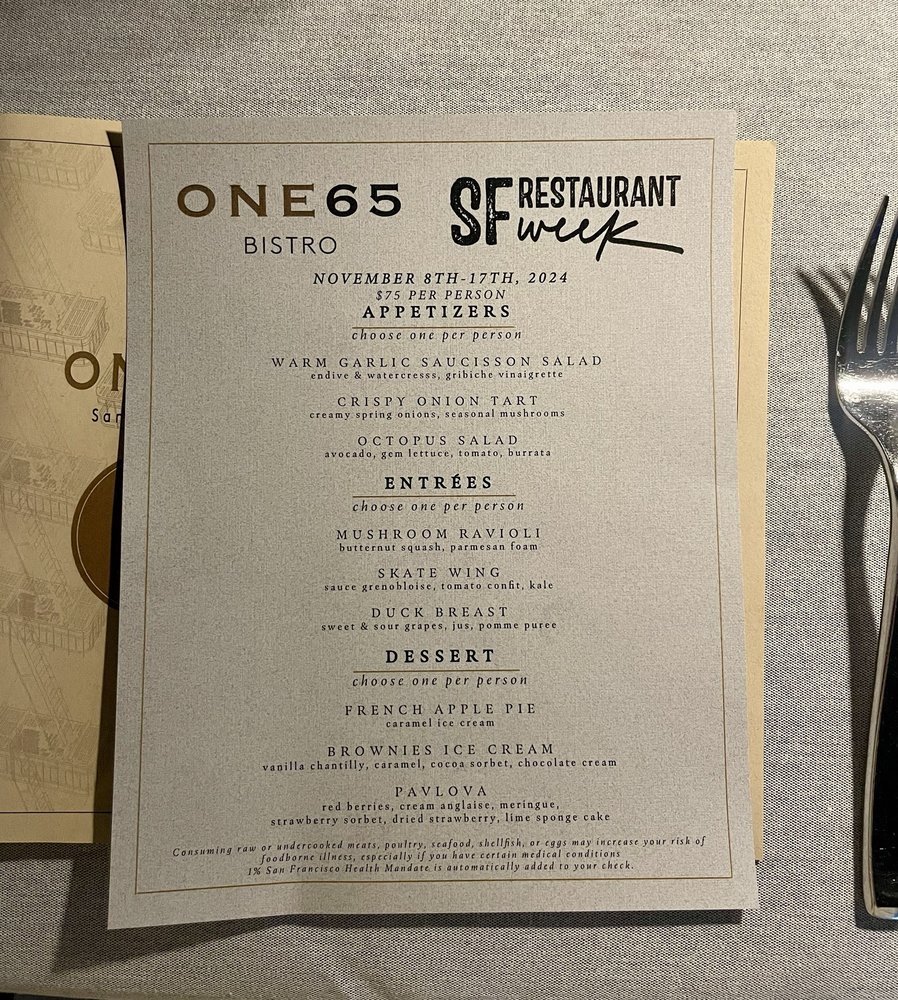 Introducing the menu at ONE65 Bistro, a French-New American restaurant located in San Francisco. The restaurant offers a variety of small bites and appetizers, including Salted Cod Cromesquis, Jamon Ibérico, and Scallop Ceviché. Customers rave about the Mushroom Raviolis, Crispy Onion Tart, and French Apple Pie. The unique concept of having different dining experiences on each floor adds to the charm of this establishment. The Pick 3 dinner menu allows patrons to enjoy an appetizer, main dish, and dessert without feeling overly stuffed. The ambiance is described as quiet and elegant, perfect for a date night or casual dinner. The attentive service and delicious cocktails like the Floral Fixation drink with a beautiful ice rose make for a memorable dining experience at ONE65 Bistro. So, if you're looking for an upscale yet relaxed dining experience in San Francisco, be sure to check out ONE65 Bistro.
